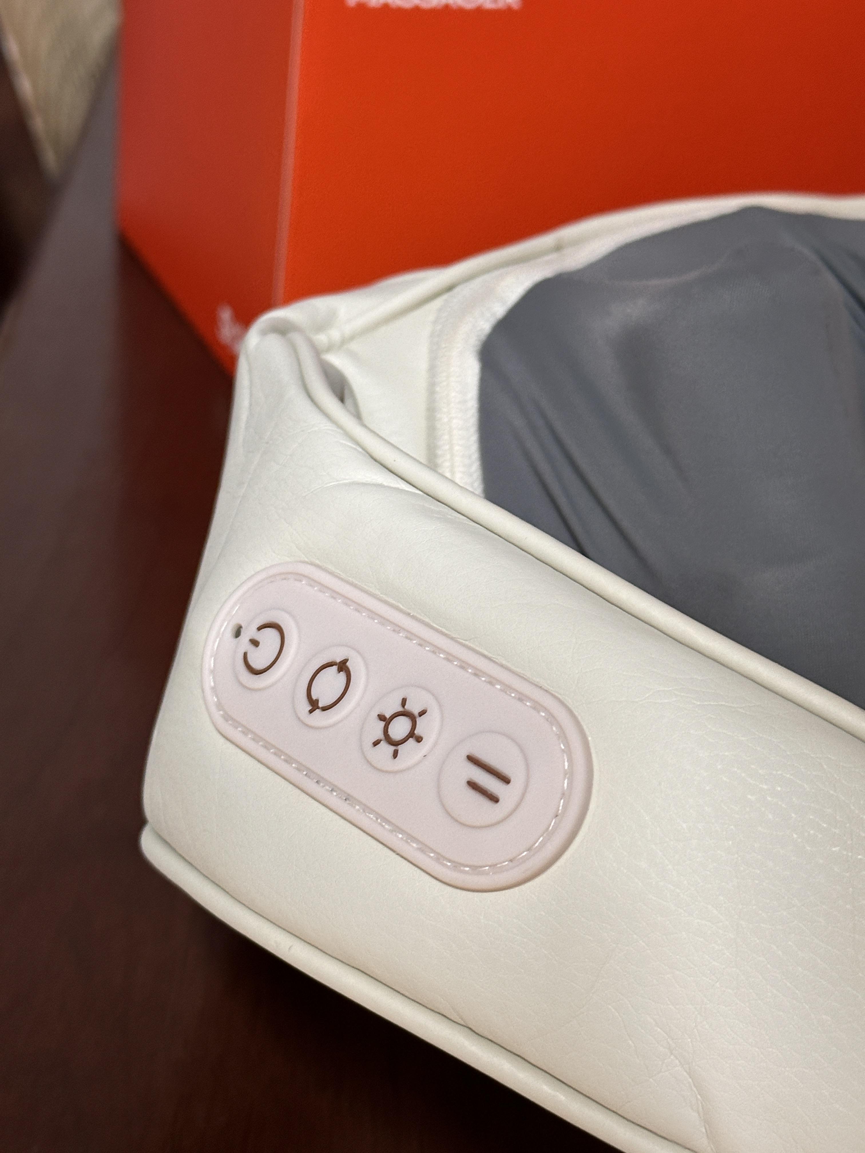 마사지기 사용법은 간단하다 어깨에 올려서 전원버튼을 켜 사용하면 된다. 버튼은 총 네가지로 사진 속 위에서부터 전원, 지압모드 변경, 열, 빠르기 변경이 있다.