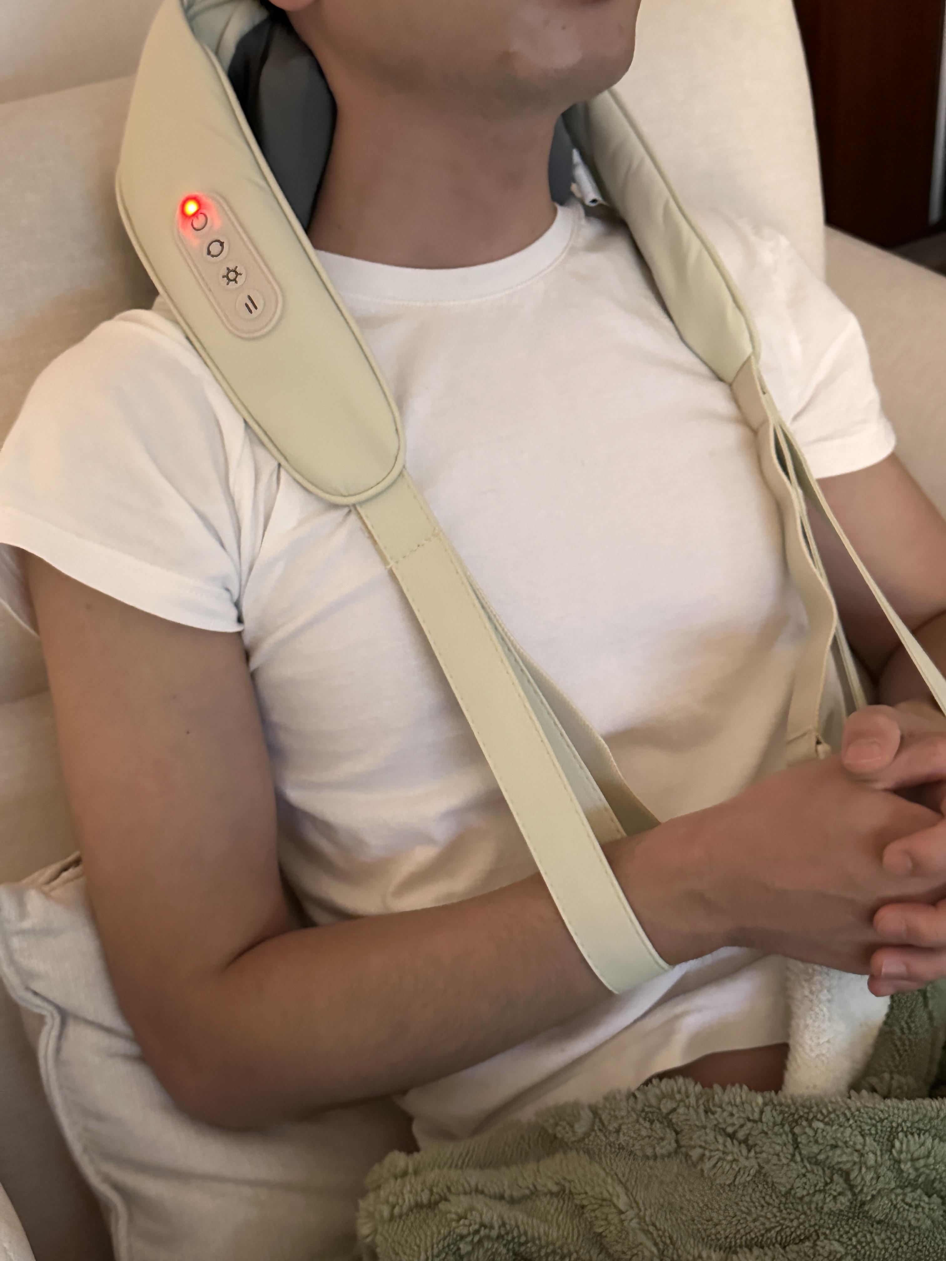 이름 그대로 목과 어깨를 조물조물 주물러 주는 것인데 팔걸이를 하고 있으면 생각보다 압이 세서 아프고, 팔걸이를 안 하고 있으면 고정이 안되기 때문에 불편해진다. 어떻게 해도 불편함 ㅠㅠ!